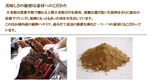 筑紫平野は古来より農産物の宝庫として知られ上質の小麦粉が生産されています。 黒棒はこの上質小麦粉と、長崎にカステーラと共にポルトガルより伝えられたビスケットの製法を基に南国特産の黒砂糖を生かして誕生したお菓子と言われています。