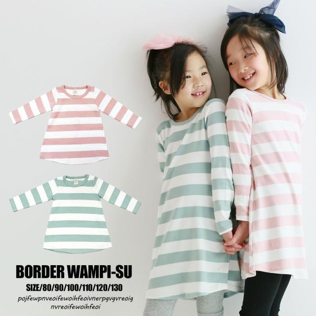 【SALE】◇ワンピース ミルクピンク ミルクグリーン 子供服 女の子 春 長袖 ボーダー チュニック キッズ 80 90 100 110 120 130