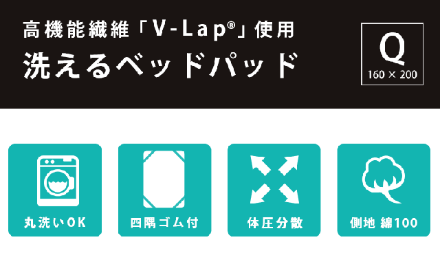 帝人の高機能繊維「V-Lap(R)」を中わたに使用したベッドパッド。V-Lap(R)が持つ高反発性により、優れた弾力性と体圧分散性を発揮します。