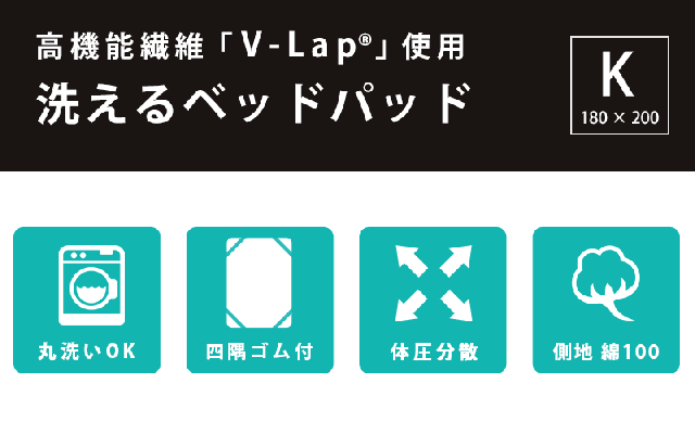 帝人の高機能繊維「V-Lap(R)」を中わたに使用したベッドパッド。V-Lap(R)が持つ高反発性により、優れた弾力性と体圧分散性を発揮します。