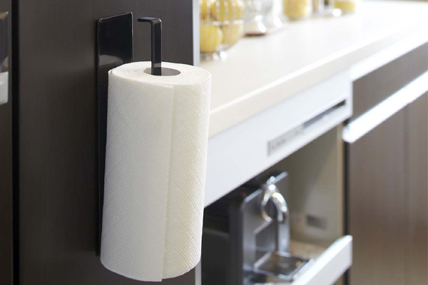 タテにしてキッチンペーパーやロール式のゴミ袋を収納したり、ヨコにしてタオルや布巾を掛けてもお使いいただけます。中央のバーに差し込むだけで使えるので、付け替えもスムーズに。