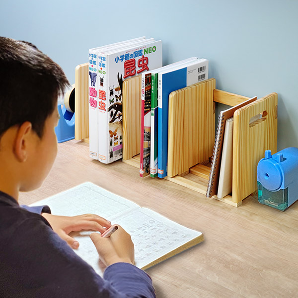 伸縮を中間幅にすると、仕切り板を2枚使いできます。3つの収納スペースができるので、図鑑、教科書、ノートなど本を種類別に分けて使いやすい工夫をしながら整理整頓できます。また背面には落下防止バーが付いていて、本がうしろに倒れるのを防ぎます。