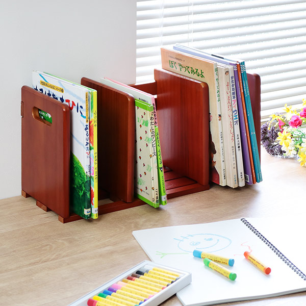 木製で重厚感のあるブックスタンドは、収納の配置バランスを気にしなくても、しっかり安定します。通常のブックスタンドでは収納が困難なB4サイズのスケッチブックや高さがバラバラの絵本も安定して収納できます。