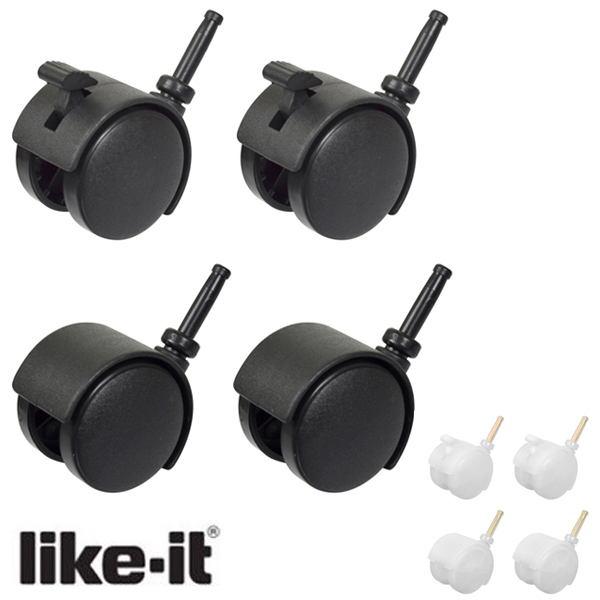ライクイット製品の便利なストッパー機能付きキャスターです。差し込むだけで簡単に取り付けられます。キャスターを取り付けることで移動が楽に、床まわりの掃除もしやくすくなります。キャスター耐荷重は50kgなので、耐荷重の範囲内でご使用下さい。