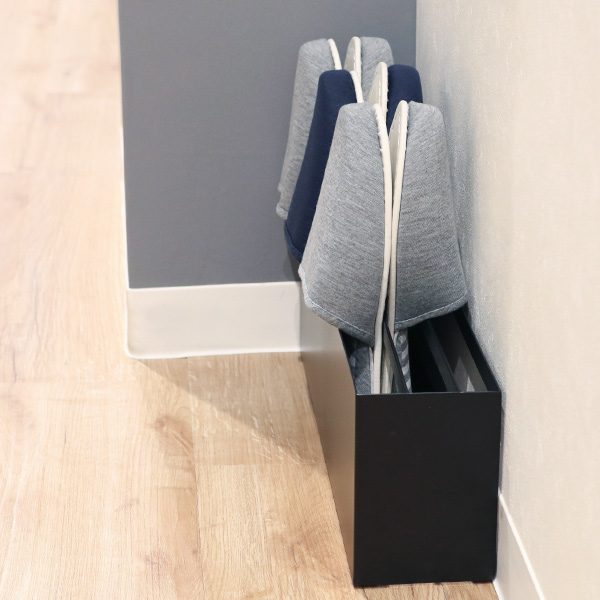 裏面を重ねてフレームに差し込むだけの機能的なデザイン。スリッパの出し入れもストレスなくおこなえます。裏面は枠のみなので通気性も抜群です。コンパクトながらも4足収納可能なので、ご夫婦・ご家族でもお使いいただけます。