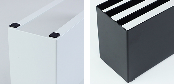 | 滑り止め付き 底にはクッションが貼ってあるので滑らず使いやすく、床を傷つける心配もありません。 | マットな質感 お部屋に馴染むマットな質感です。カラーもホワイトとブラックでインテリアを邪魔することなくお使いいただけます。 |