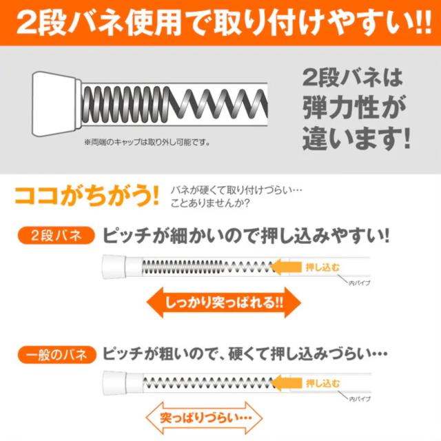 ポールを回転させて長さを調整します。回転することでバネを押し込んで固定する構造です。2段バネ式は、狭い範囲から広い範囲まで通常のタイプより強力に突っ張ります。
