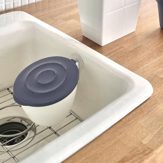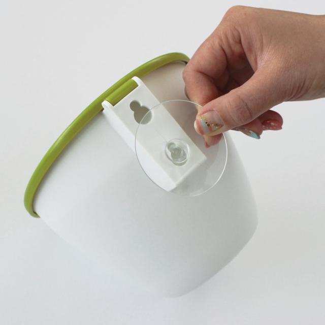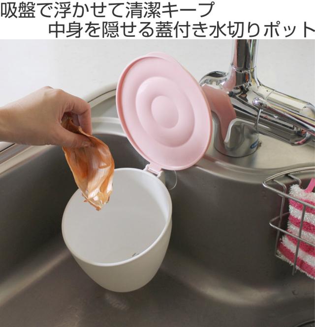 吸盤式の水切りポットです。底面をシンクから浮かせて使えるので水切れが良く、清潔にお使いいただけます。またフタ付きなので、嫌な臭いや害虫をシャットダウンでき、見た目にもすっきりとした清潔感あるシンクをキープできます。