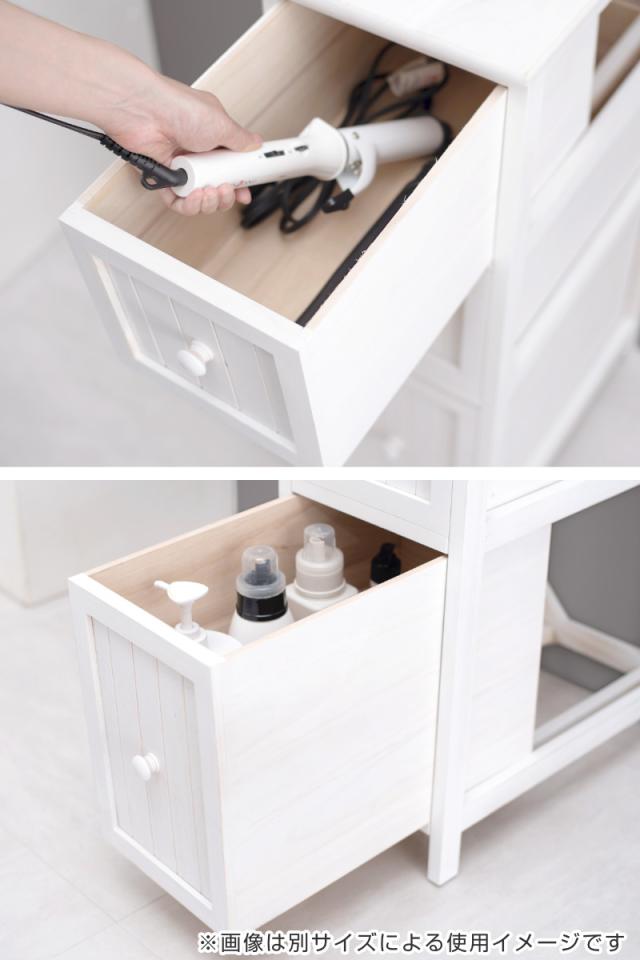 上・中段はタオルや衣類、雑多な小物の収納に適しており、長さのあるアイロンなども入ります。下段は深さがあるので、高さのあるボトル類も収納できます。