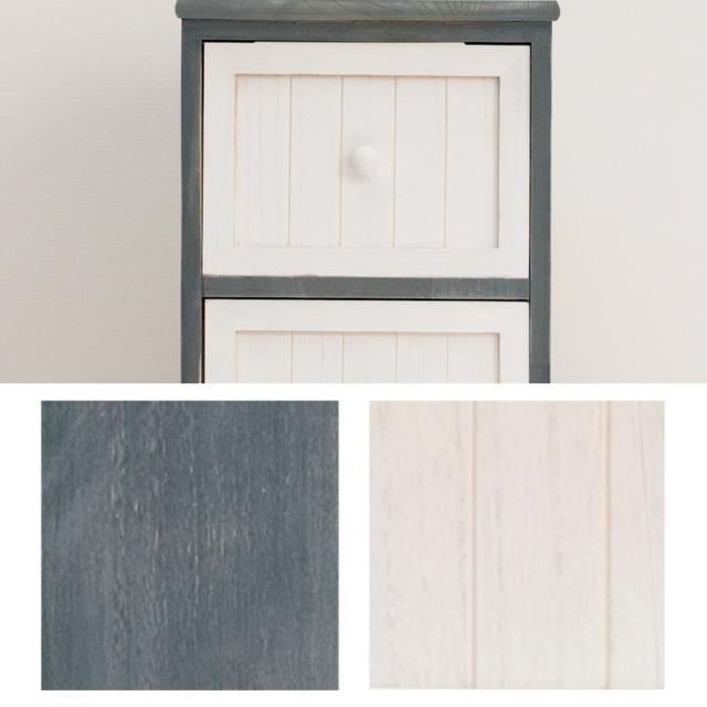 濃淡、かすれのある塗装により、アンティークの風合いを表現しています。ブルーグレーはツートンカラーで、くすみ色がお洒落な雰囲気を演出します。ホワイトは真っ白ではないシャビー感のある色合いがポイントです。