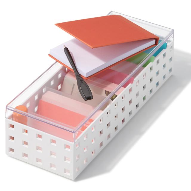 フタをすれば重ねて使用できます。積み重ねることで、縦のスペースを有効活用できて机や棚が片付きます。