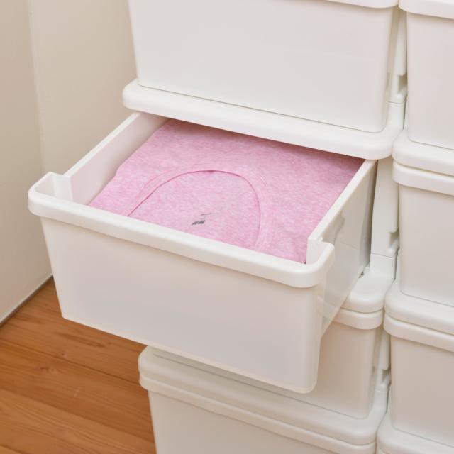 一段あたりの収納目安は、Yシャツなら約6枚、セーターなら約4枚、バスタオルなら約4枚です。コンパクトな見た目なのにしっかりと収納できます。