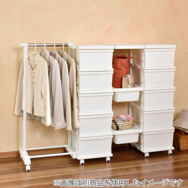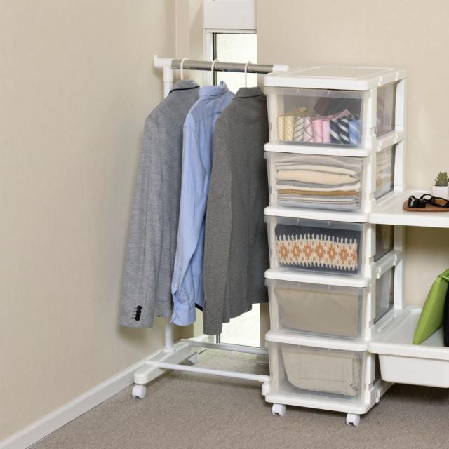 | 材質 | 天板、本体枠、支柱、引出し、ハンガー部部品:ポリプロピレン キャスター:ポリプロピレン(鉄心入) ハンガーパイプ:鉄 他パイプ:鉄(PPコート) |