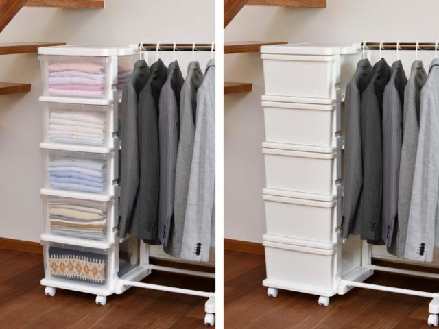シンプルなデザインで使いやすい、パイプハンガー付きのチェストです。掛ける収納としまう収納をこの一台でできるから、片付けがグッとしやすくなります。組み立ては工具不要で簡単にできます。