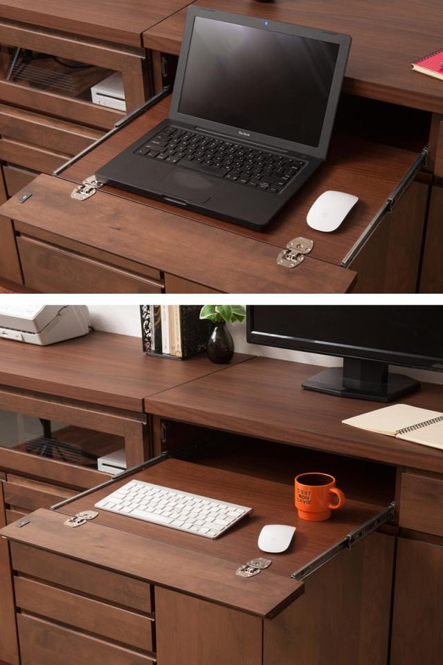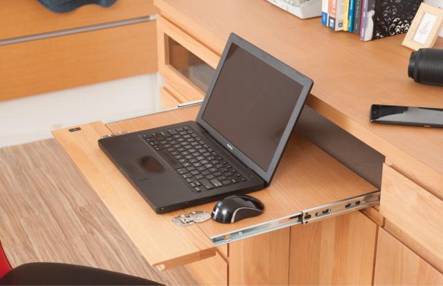 ノートパソコンやキーボードの収納に便利なスライド棚です。前板は使用時に手前に倒れる仕様なので、フラットな状態で使うことができます。前板をあげて引き出しのようにサッと格納すれば、すっきりと片付けることができます。