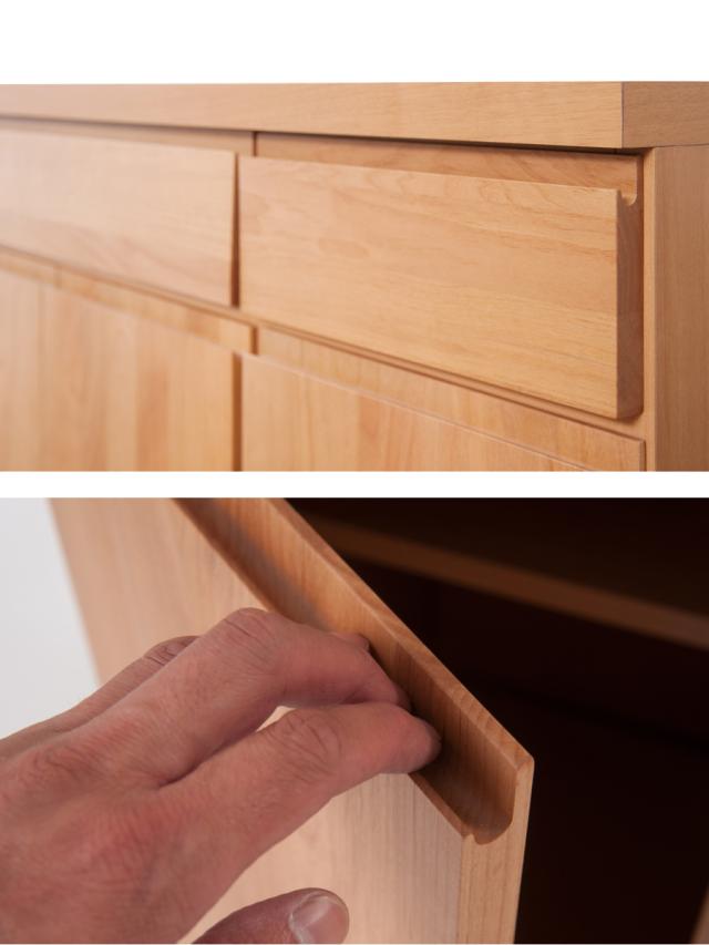 美しい木目の素材感を活かすため、引出しにあえて引手を付けず手掛け加工を施しました。飽きのこないスッキリとしたデザインが印象的です。
