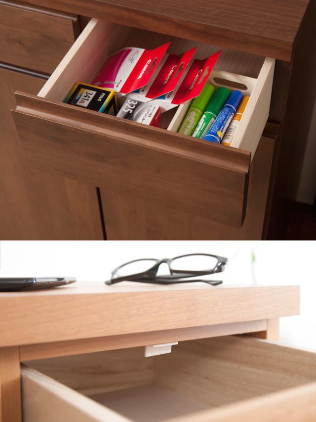 程良い深さの引出しは、よく使う文房具や常備薬などの細かい物の収納に最適です。ストッパー付きなので、引き出しすぎてしまっても安心です。