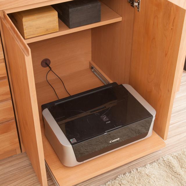 デスク面下の扉にはプリンターを収納できます。可動棚板が付属しているので、予備のインクや印刷用紙も一ヶ所にまとめておくことができるので便利です。配線穴付きなので、プリンターを設置したままプリントすることも可能です。