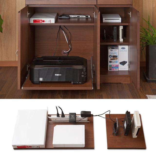 印刷用紙やWi-Fiルーター、電源タップもまとめて収納することができます。棚板後方には隙間を設けてあるので棚板をまたいでの配線も可能です。