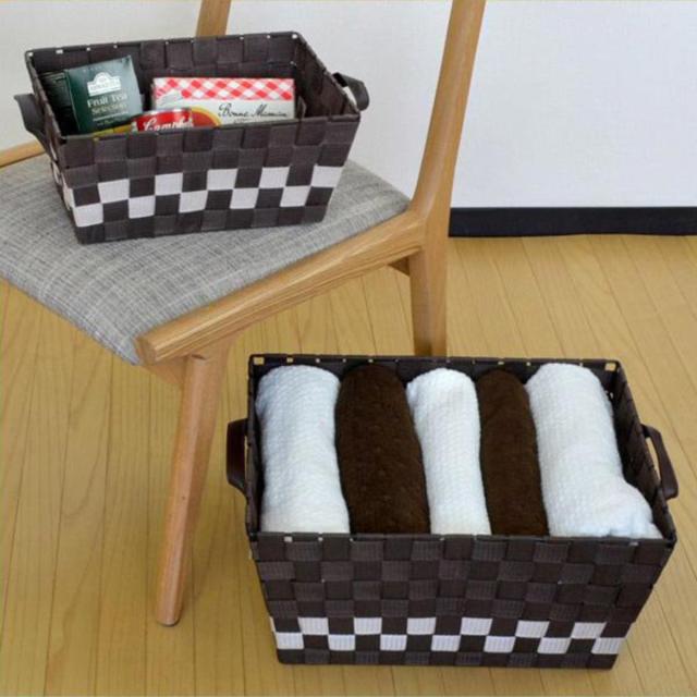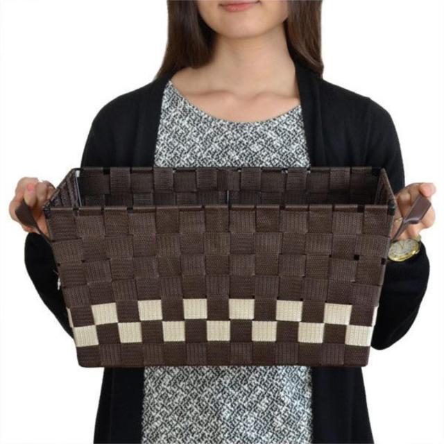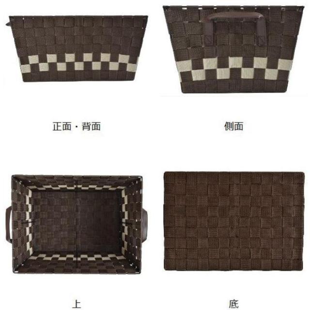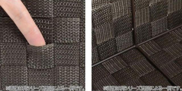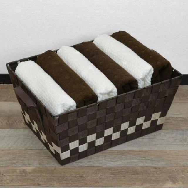 ポリプロピレン合成素材のテープを編みこんだ、丈夫で通気性が良く、湿気にも強いバスケットです。衣類の収納にもピッタリです。バスタオルなら6枚収納できます。