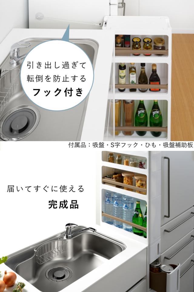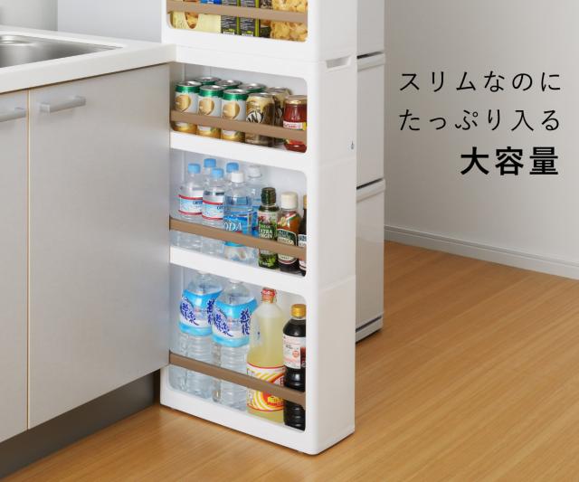 キッチン、洗面所、トイレなど家の中にある今まで使うことのできなかった17cmの狭いすき間を、収納スペースとして有効活用できます。デッドスペースになっていた隙間にぴったりと収まり、キッチン小物を隠してすっきり整理整頓できます。