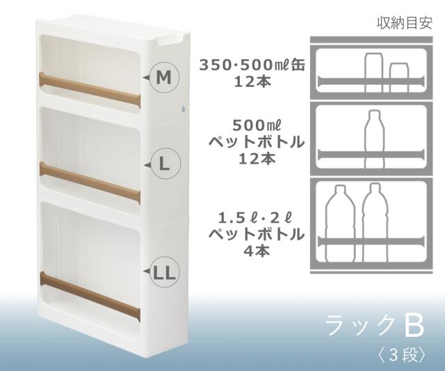 真ん中の「L」サイズの棚は、500mlペットボトルが収納できるサイズです。飲料水や洗剤などのストックにも最適です。