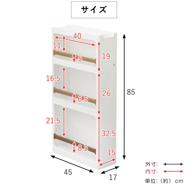 | サイズ | 約 幅17×奥行45×高さ85(cm) 【内寸】 M:約 幅15×奥行44×高さ19(cm) L:約 幅15×奥行44×高さ26(cm) LL:約 幅15×奥行44×高さ32.7(cm) |