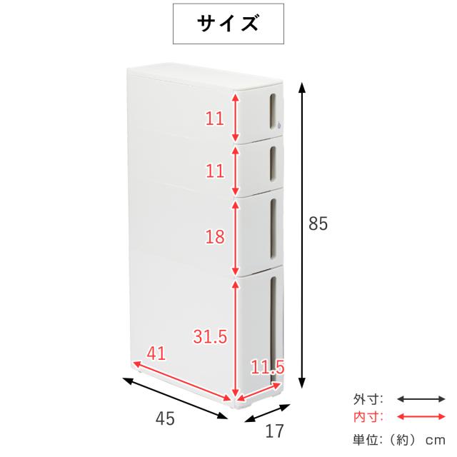 | サイズ | 約 幅17×奥行45×高さ85(cm) 【引き出し内寸】 S:約 幅11.5×奥行41×高さ11(cm) M:約 幅11.5×奥行41×高さ18(cm) LL:約 幅11.5×奥行41×高さ31.5(cm) |