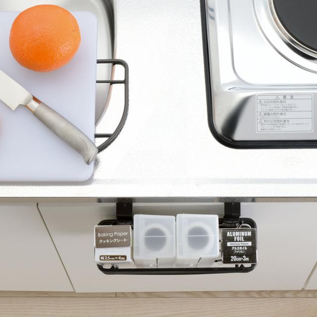 ラップ類だけでなく、よく使う調味料の収納にも便利です。動かず取れるので忙しい調理の時間がスムーズになります。