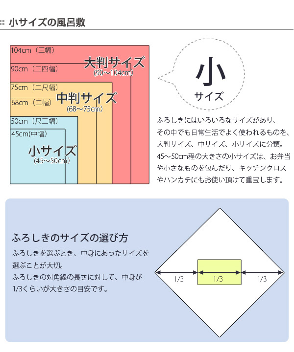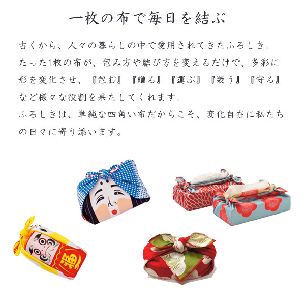 サイズは48cmなので、贈答の品としてはもちろん、お弁当を包むランチクロスや包み方しだいでティッシュカバーやブックカバーとしてもお使いいただけます。