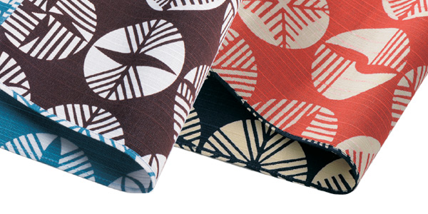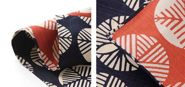 | 特殊なリバーシブル加工 表裏が全く同じ柄のリバーシブル加工はとても珍しく、熟練した京都の染め職人の技と高度な技術が必要です。 | 洗えて丈夫なシャンタン 洗えて、重い荷物も安心して包める丈夫さがあり綿素材の中で現在もっとも人気の素材、シャンタン。使い込むほどにソフトでやさしい風合いになります。 |
