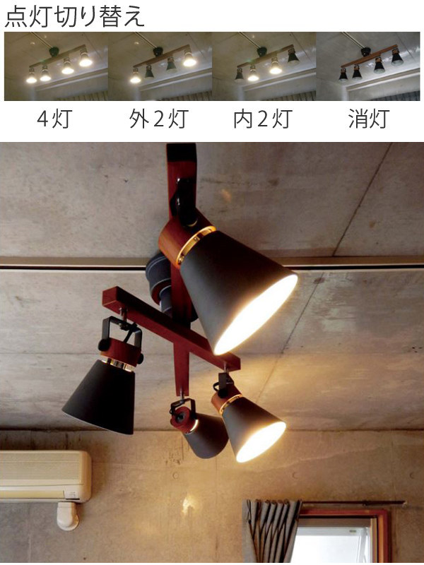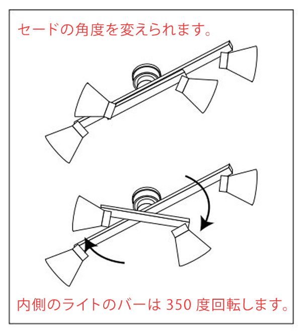 二重の可動式4灯シーリングライトです。天然木とスチールでつくられており、北欧テイストでインテリアに馴染みやすく、おしゃれなデザインです。バーを回転させたり、セードの角度を調整することができるので、お部屋に合わせてアレンジしていただけます。