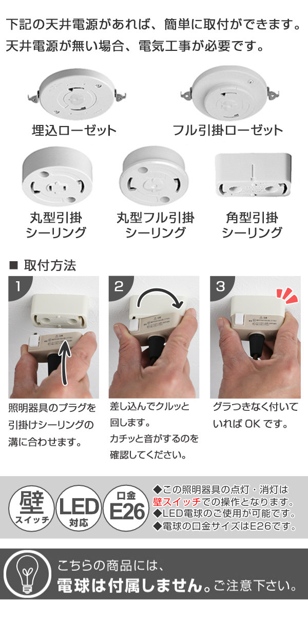 | 備考 | 点灯:リモコン 取付方法:引掛けシーリング 電球:E26/60Wまで(4個) LED・蛍光灯・白熱球使用可能 |