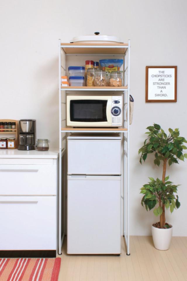 冷蔵庫の上が収納スペースとして使える冷蔵庫ラックです。電子レンジや調理器具、食品などキッチンで使う物をスッキリと収納することができます。