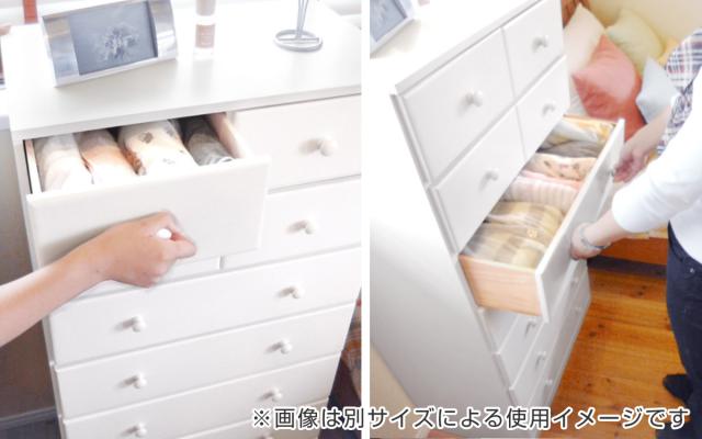 小さい引出しには小物類、また大きめの下段にはかさばりやすい衣類を、5杯の引出しを使い分けて収納していただけます。
