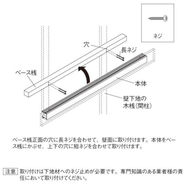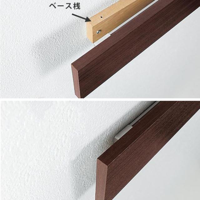 ベース桟を壁面にネジで固定し、その上から本体の長押ラックを取り付けます。ベースがしっかりとしていて、安全荷重が10kgと安心です。