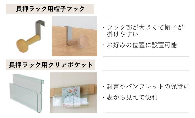 ![]() コートフック | ![]() 帽子フック | ![]() クリアポケット |