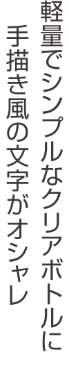 ![]() 高い透明度で、中に入れるものの色を楽しむ 中身が綺麗に見えるクリアボトルですので、ミネラルウォーターや炭酸水に好きな果物や野菜、ハーブを入れたデトックスウォーターやスムージーを入れると色が映えてさらにオシャレに♪ シンプルなボトルに手書き風の文字がアクセントになった、何を入れても絵になるデザインです。 |