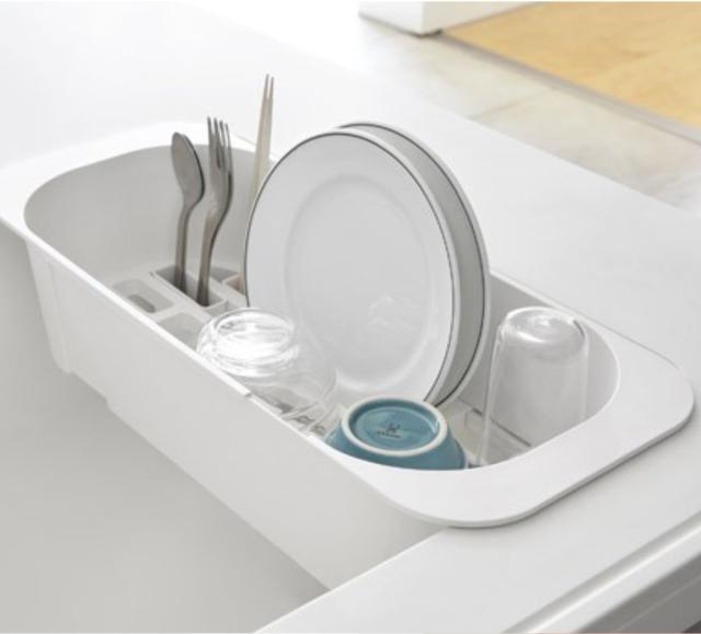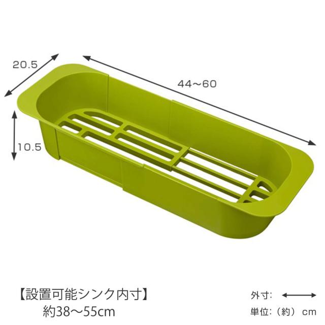 シンクの幅に合わせて伸縮可能な水切りかごです。内寸が約38cm〜55cmまでのシンクに設置することができます。