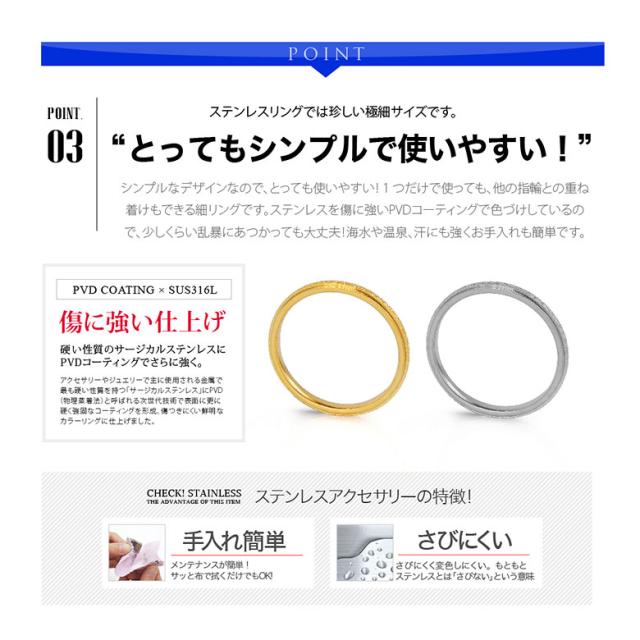 スリムタイプの指輪の表面にちいさな凹凸をつけてきらきらと輝く特殊加工をした極細のステンレス製のリングです。医療用メスなどにも使われる316Lサージカルステンレスを使って作られているので、アレルギーも出にくく傷や変色に強いので、とても使いやすい指輪です。細いサイズなので、シンプルにさらっと着けるのも、他の指輪との重ね着けにするのもおススメです。