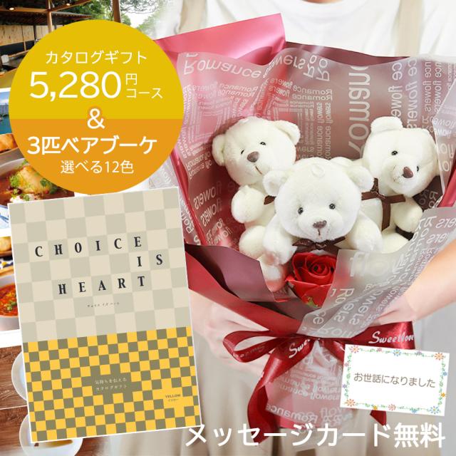 グルメや雑貨、お好きなものを選んでもらえるカタログギフトと枯れないソープフラワーと可愛らしいくまのブーケ。
