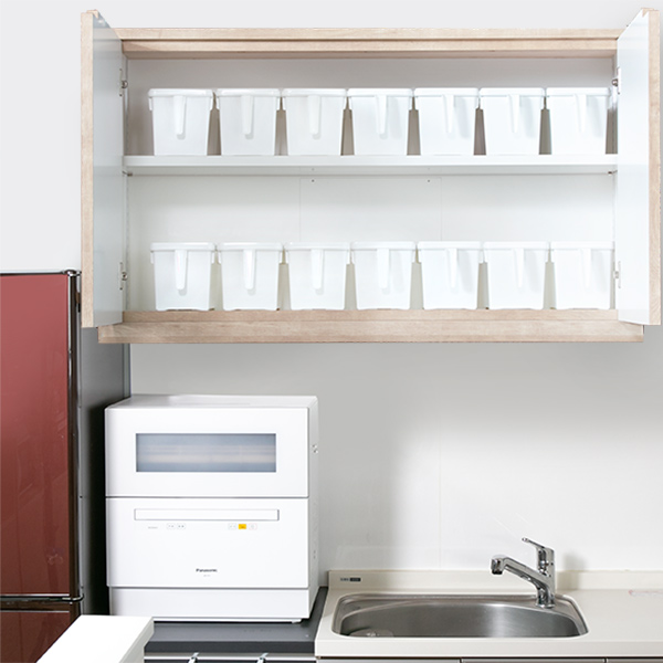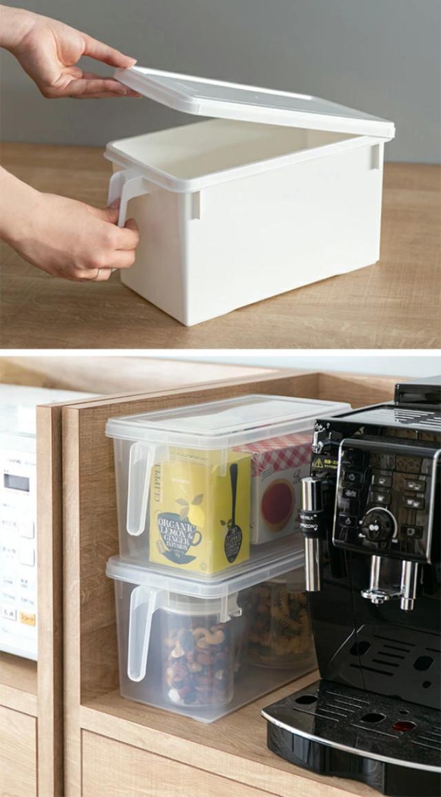 キッチン収納の空間を無駄なく使えるハンドル付きストックボックス。普段使いしないものやストックを置いておく、高い場所の収納におすすめです。日頃使わないものは、少し手の届きにくい場所にまとめて、使いやすいキッチンに。取り出したい時もハンドル付きだから、出し入れしやすいです。