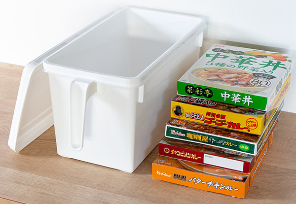 ボックスは、袋麺やレトルト食品の箱がちょうど収まるサイズ感です。