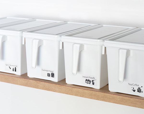 収納ボックスはシリーズ展開しており、収納場所や収納するモノに合わせて組み合わせて使えます。キッチンだけでなくパントリー収納などにも。シリーズ商品なので、ホワイトの色味やクリアの透け感も統一されます。