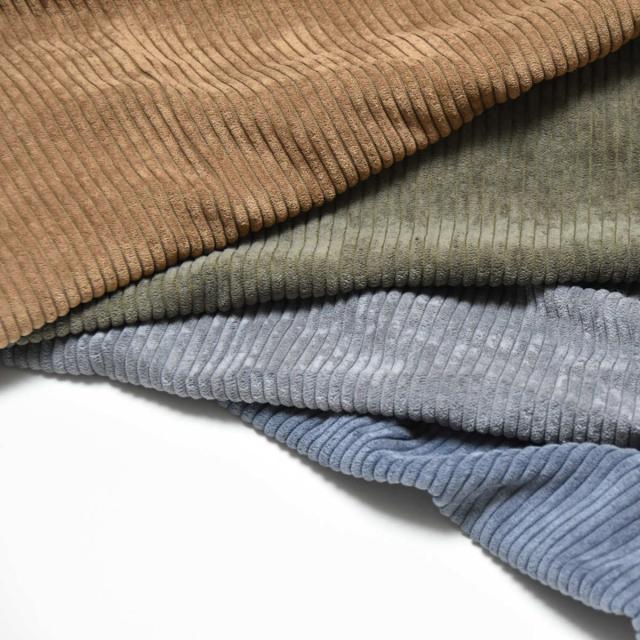 使用しているコーデュロイ生地は綿やポリエステル、ナイロンなどの素材を使って織り上げられた生地の一種です。その特徴は、縦にリブのような溝が入っていることです。この溝が生地に深みを与え、柔らかい手触りで暖かく深みのある肌触りになります。