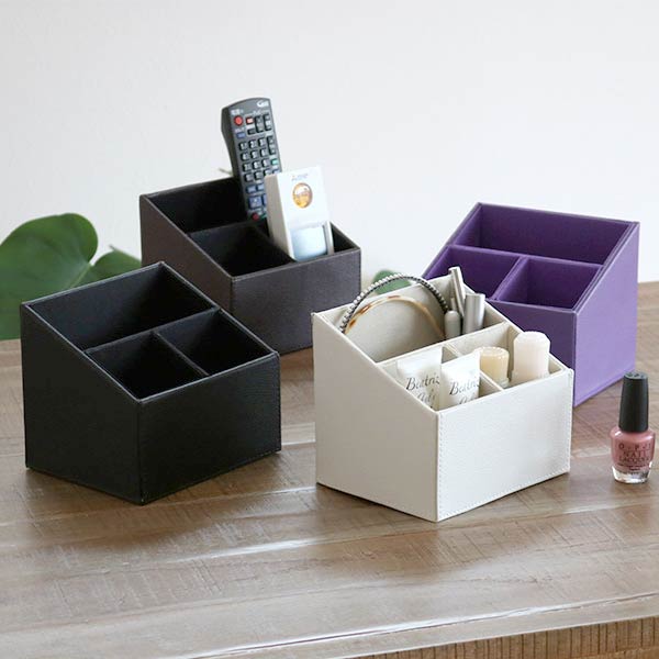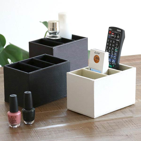 行方不明になりがちなリモコン、収納場所を決めて探し回る手間を解消できます。リモコンや文房具など、テーブル周りの小物をスッキリ収納するのにも便利です。化粧品の収納にも♪