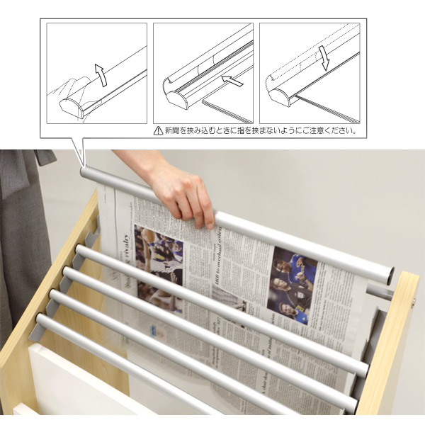 新聞紙1日分をホルダーに挟み、フックに引っ掛けるだけで簡単に掲示ができます。サッと読めてサッと仕舞える便利な仕様です。ホルダーは5本あるので5日分、または同日5社分の新聞が掛けられます。新聞紙の入れ替えも自由にできて、目立たせたい記事を前に持ってくることもできます。