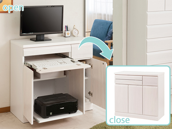 使うときだけ開いて後はきれいに収納できるから、リビングはいつもきれいなまま!閉じるだけなので、急な来客時もさっと片付けられます。パソコンやプリンター、ルーターもきれいに収納でき、閉じればインテリア性の高いキャビネットに変身しちゃうキャビネット型デスクです。