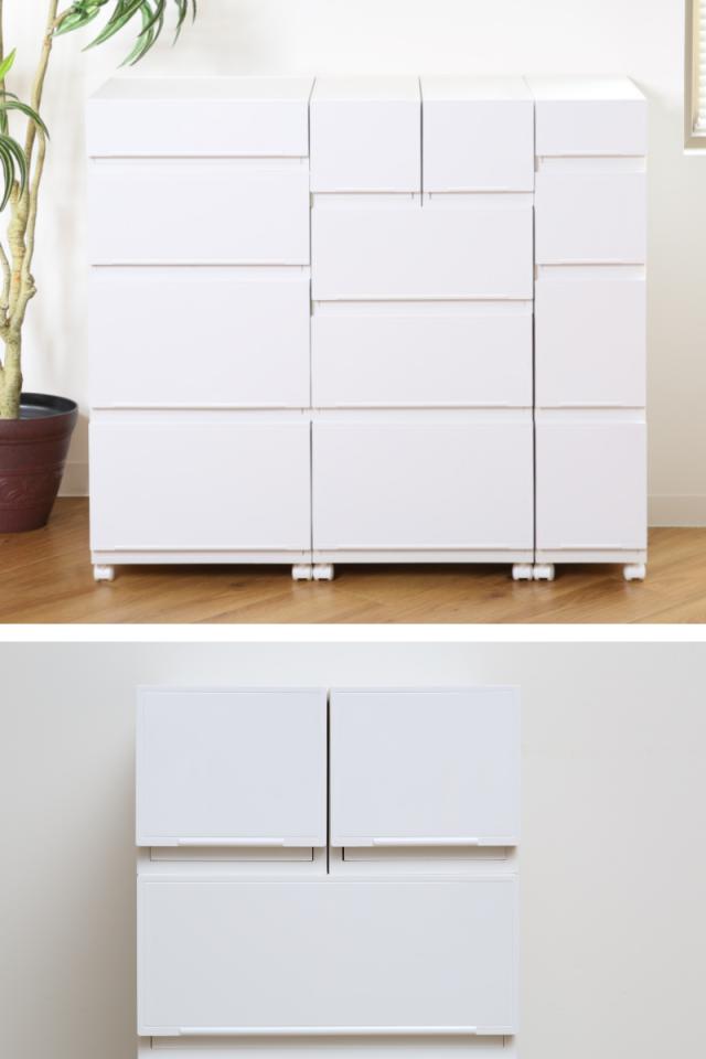 6つのサイズを自由に組み合わせられるため、収納チェストのように使うことができます。収納スペースや生活スタイルによって組み合わせを変更して、自分仕様にカスタマイズ楽しめます。ワイドサイズに、スリムサイズを横並びで2個置くことができます。