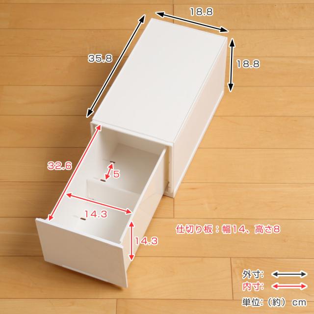 | サイズ | 約 幅18.8×奥行35.8×高さ18.8(cm) 引き出し内寸:約 幅14.3×奥行32.6×高さ14.3(cm) 仕切り板:約 幅14×高さ8(cm) |